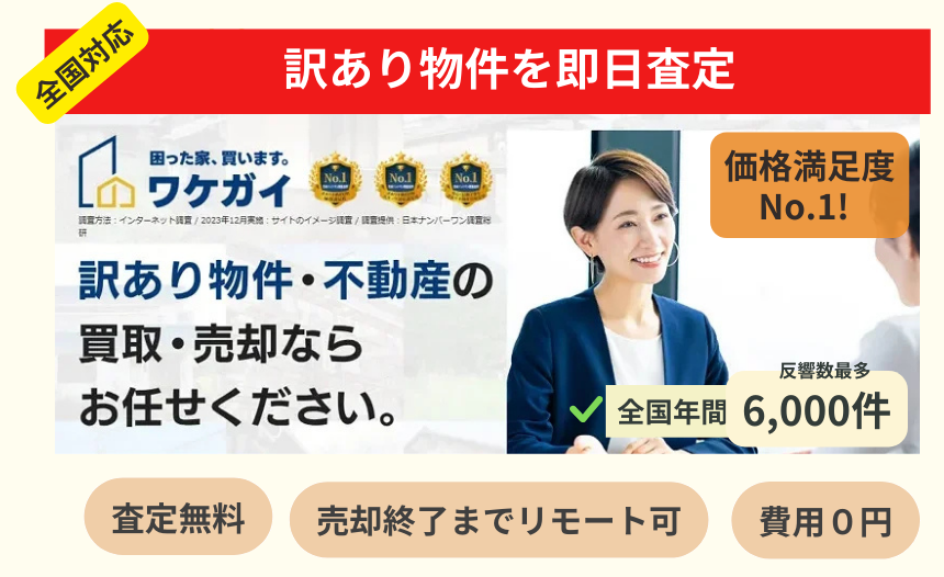 ワケガイは空き家と訳あり物件全般に対応する買取サービスで、 空き家・中古戸建 築古物件 土地 共有持分 再建築不可物件 底地・借地 事故物件 アパート、長屋、収益物件など訳あり物件全般対応。