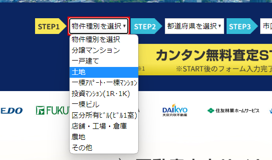 プルダウンメニューから、不動産の種類を選択するときに、「土地」または「農地」を選択することができます。